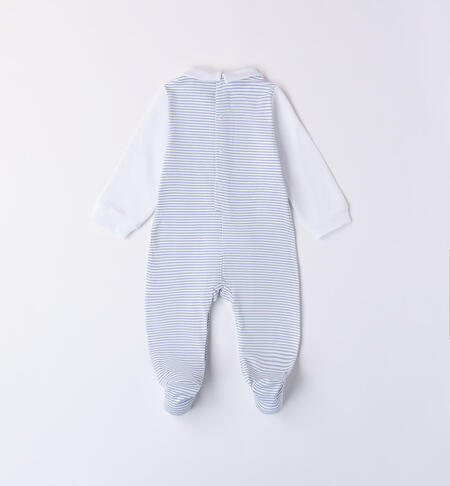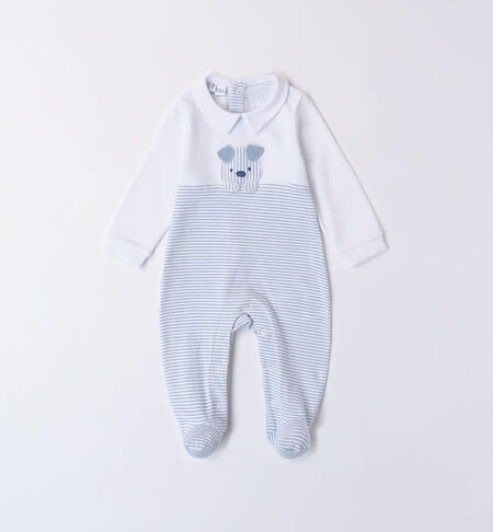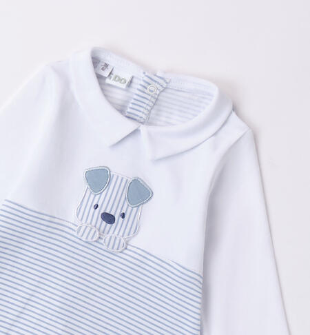 Tutina con piedini iDO per neonato realizzata in jersey stretch di cotone. La tutina è dotata di apertura sulla schiena e nell’interno cosce bottoni a pressione per agevolare il cambio e la vestizione. Il modello presenta nella parte inferiore stampa all over a righe e nella parte superiore applicazione ricamo cagnolino. Perfetta come idea regalo o per completare il Corredino neonato del futuro nascituro.