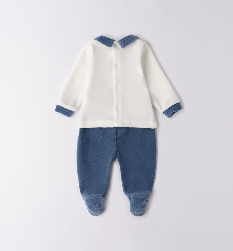 Tutina due pezzi per neonato Minibanda 0-18 mesi in ciniglia. Il modello presenta apertura sul retro con bottoni a pressione per agevolare il cambio e la vestizione.