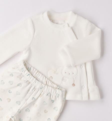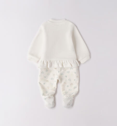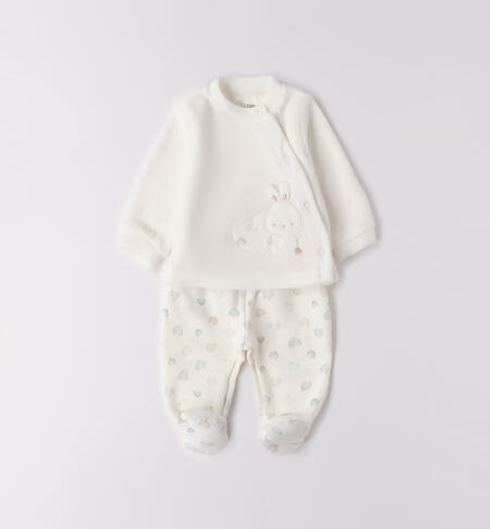 Tutina due pezzi con piede per neonata iDO in ciniglia. L’articolo presenta apertura davanti con bottoni a pressione per agevolare il cambio e la vestizione. La ghettina รจ in fantasia all over.