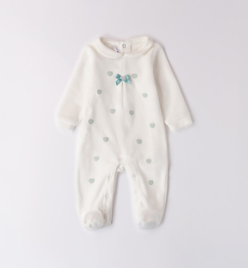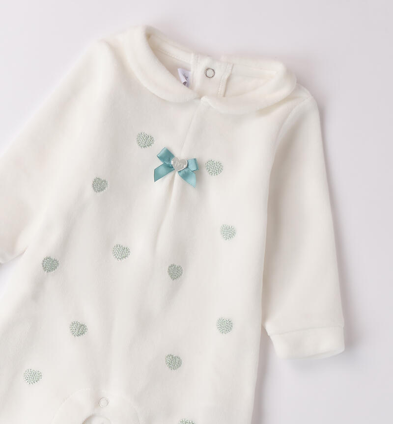 Tutina neonata Minibanda 0-18 mesi realizzata in ciniglia. Il modello presenta apertura sul retro e nel sottogamba con bottoni a pressione per agevolare il cambio e la vestizione. La tutina รจ arricchita da ricamo cuori.