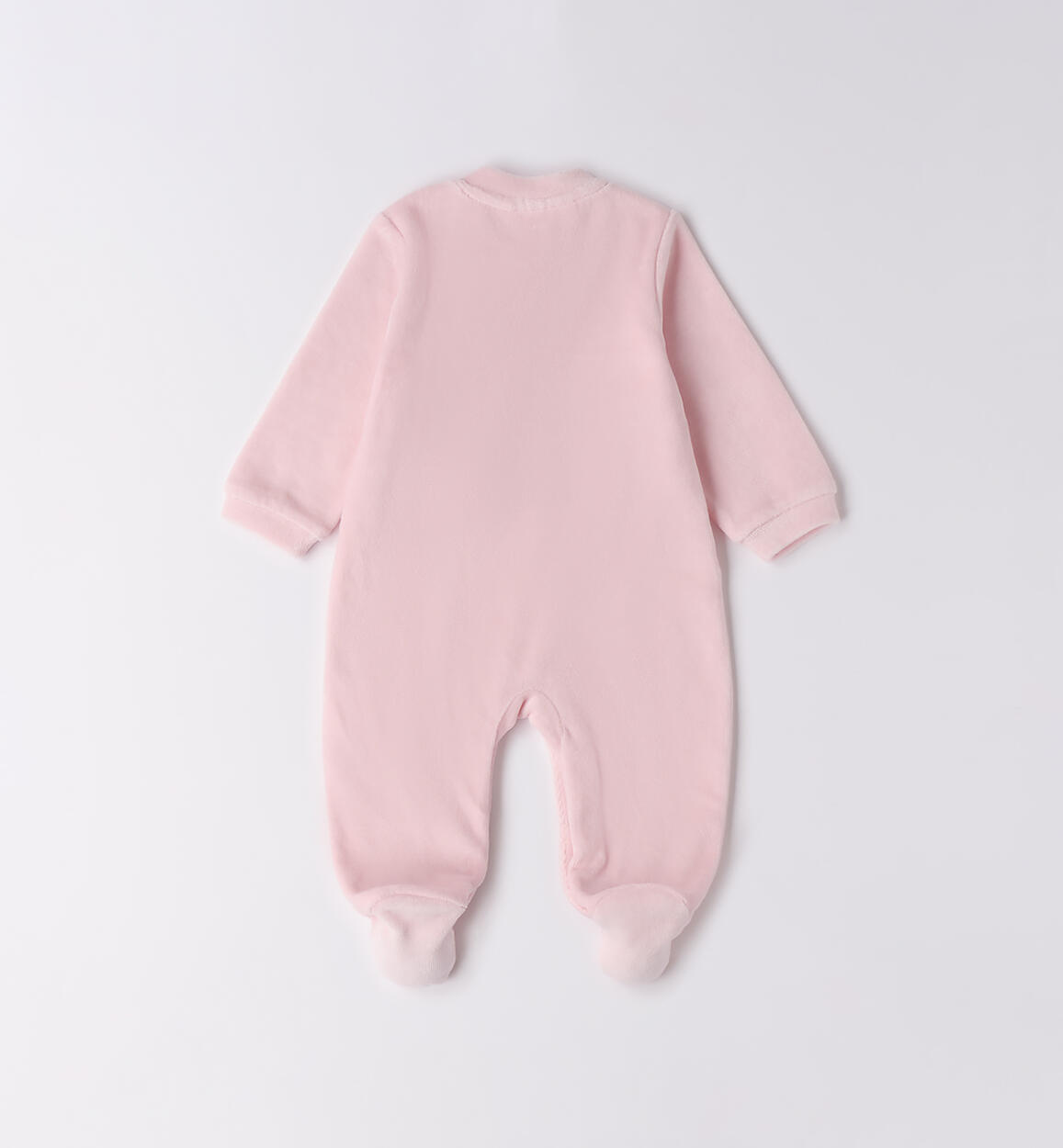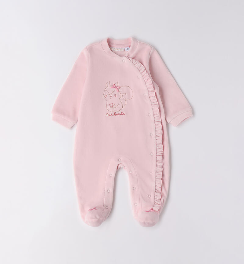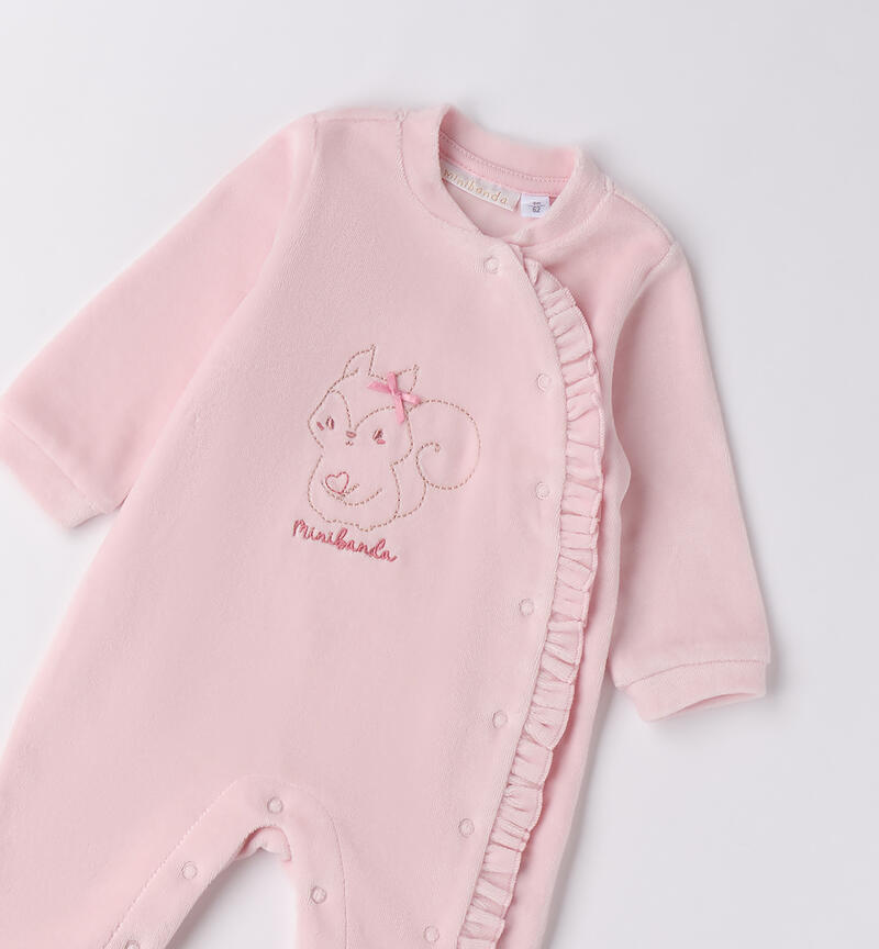 Tutina per bimba neonata Minibanda 0-18 mesi realizzata in ciniglia con ruches, ricamo e applicazione fiocchi. Il modello presenta apertura davanti e nel sottogamba con bottoni a pressione per agevolare il cambio e la vestizione.