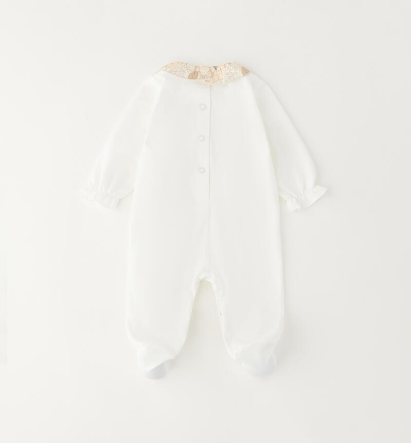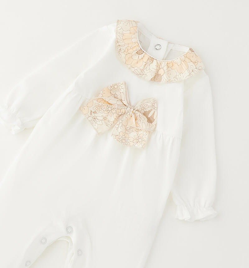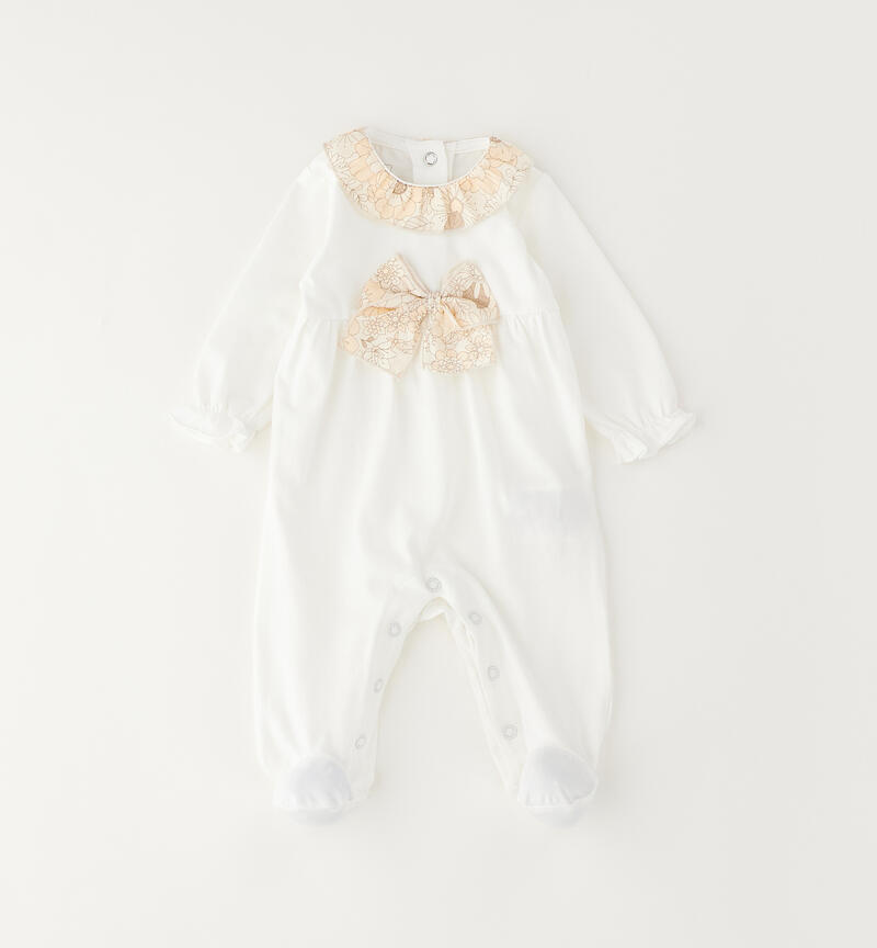 Tutina intera con piede per neonata Minibanda realizzata in jersey stretch di cotone. Il modello presenta apertura sul retro e nel sottogamba con bottoni a pressione per agevolare il cambio e la vestizione. Colletto e fiocco in satin dalla fantasia all over.