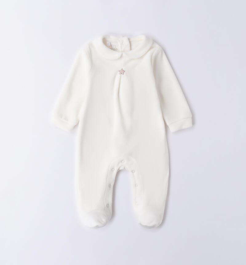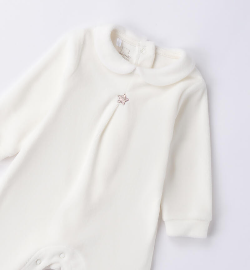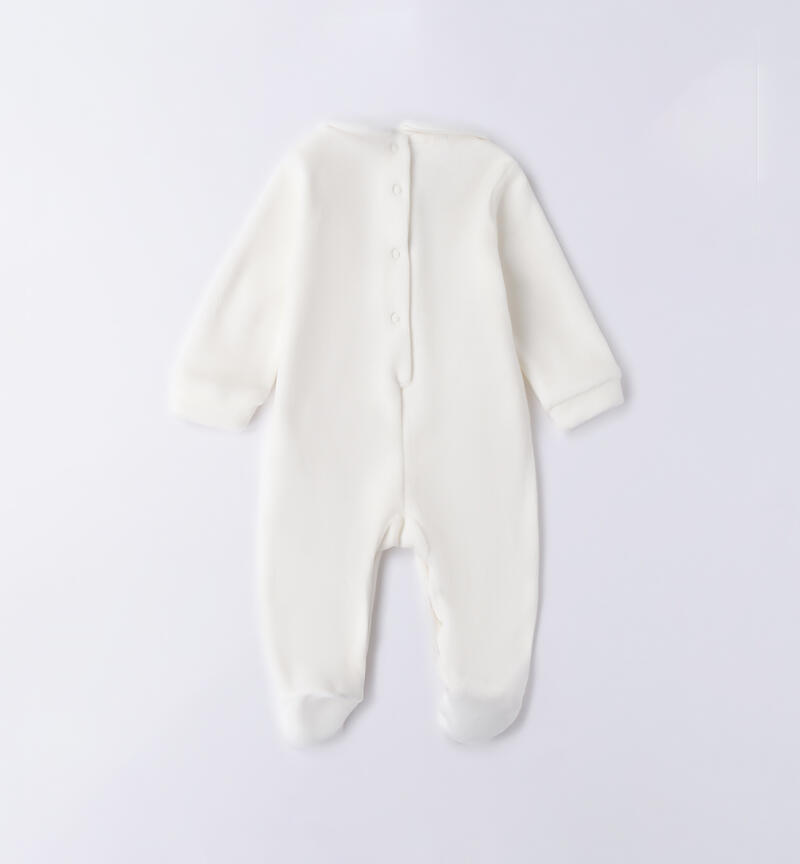 Tutina neonati modello unisex Minibanda 0-18 mesi realizzata in ciniglia. Il modello presenta apertura dietro e nel sottogamba con bottoni a pressione per agevolare il cambio e la vestizione.
