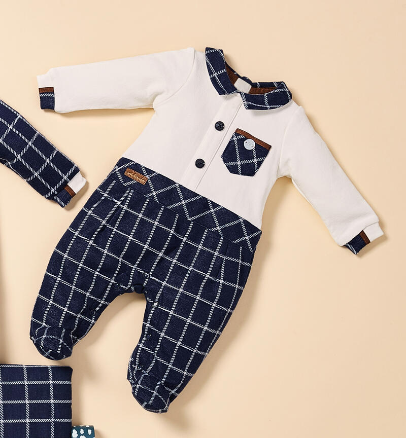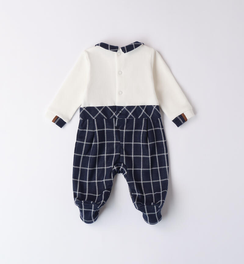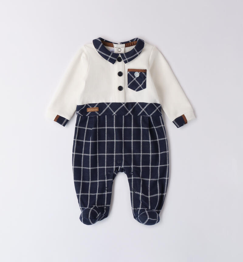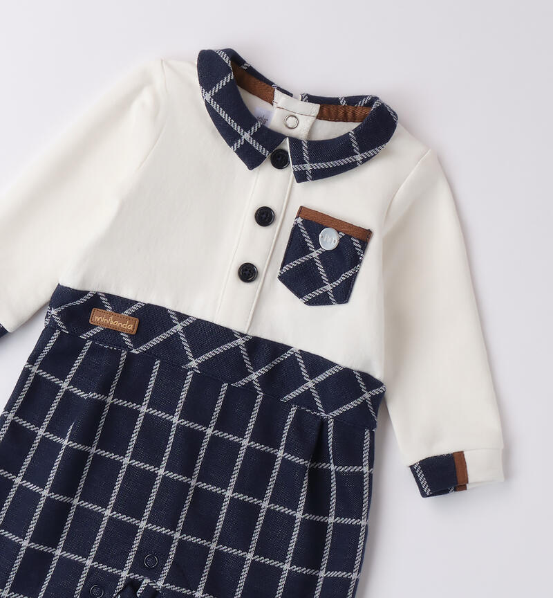 Tutina neonato Minibanda 0-18 mesi realizzata in tessuto felpato. Il modello presenta apertura sul retro e nel sottogamba con bottoni a pressione per agevolare il cambio e la vestizione. La tutina รจ realizzata in fantasia tinta unita nella parte superiore e a quadretti nella parte inferiore.