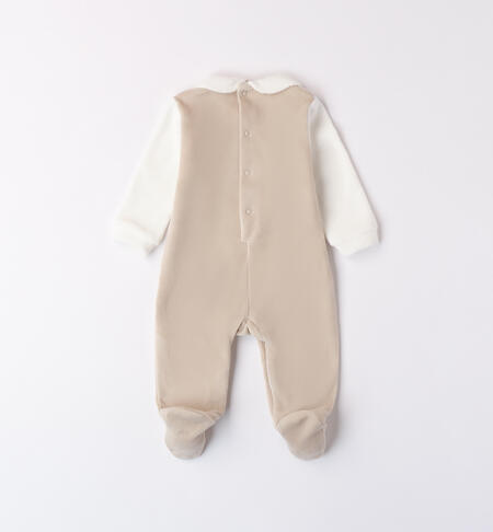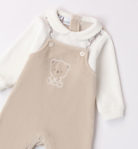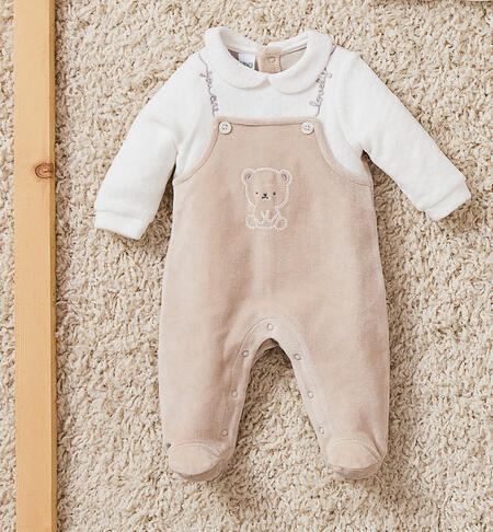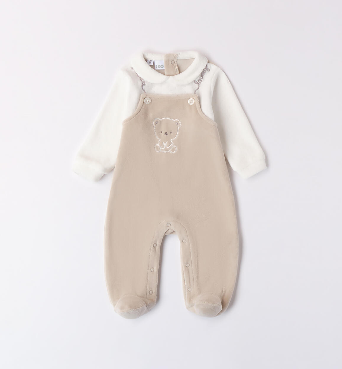 Tutina per neonato iDO 00-18 mesi in ciniglia. Il modello presenta apertura sul retro e nel sottogamba con bottoni a pressione per agevolare il cambio e la vestizione. La tutina, con finta salopette, รจ realizzata in fantasia bicolor di tinta unita e ricamo frontale
