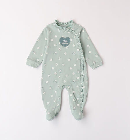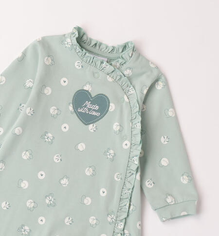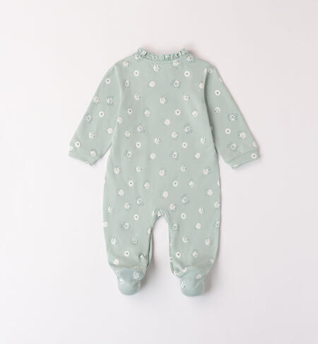 Tutina intera con piedini iDO per neonata realizzata in jersey stretch di cotone con fantasia all over. Apertura davanti e nell’interno cosce con bottoni automatici