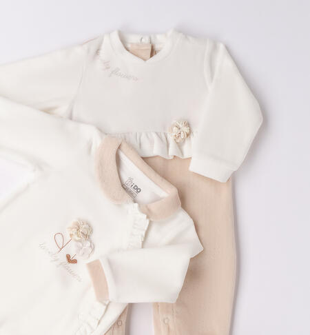 Kit per neonata iDO 0-18 mesi in ciniglia composto da due tutine. Un modello ha l’apertura dietro con bottoni a pressione, mentre nell’altra รจ davanti.